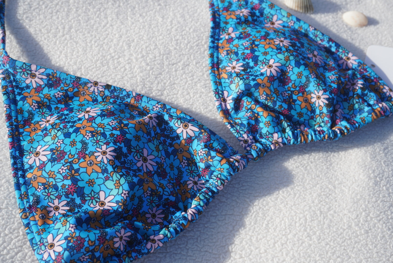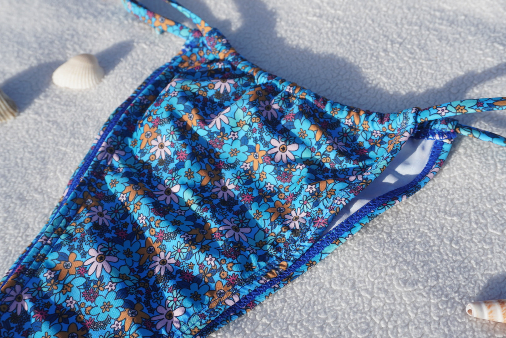 Bikini set color azul con flores en distintos tonos de azul y anaranjado. Es ajustable de un solo lado de las caderas. Se puede pedir distintos tamaños para las piezas. Se venden juntos.