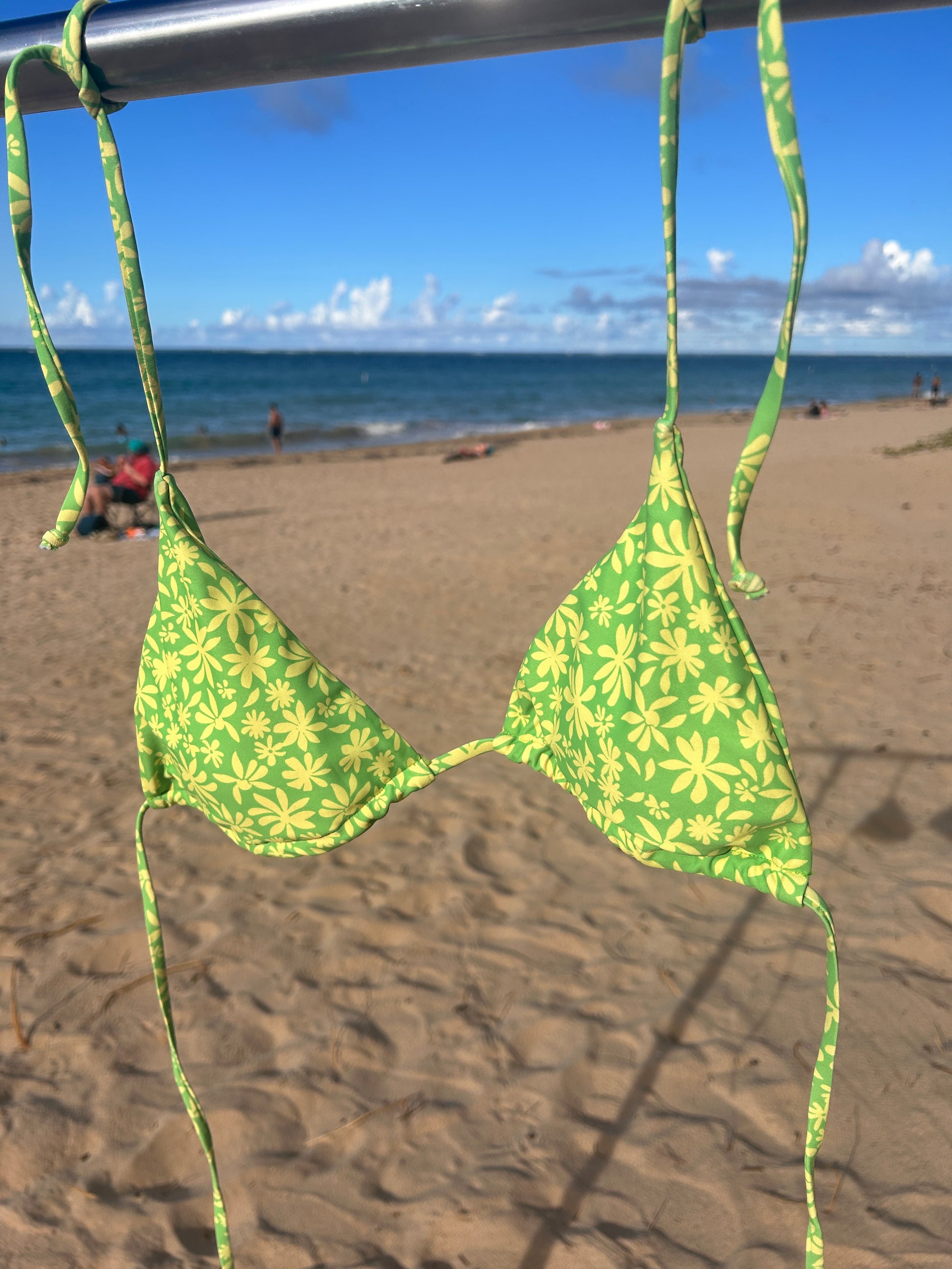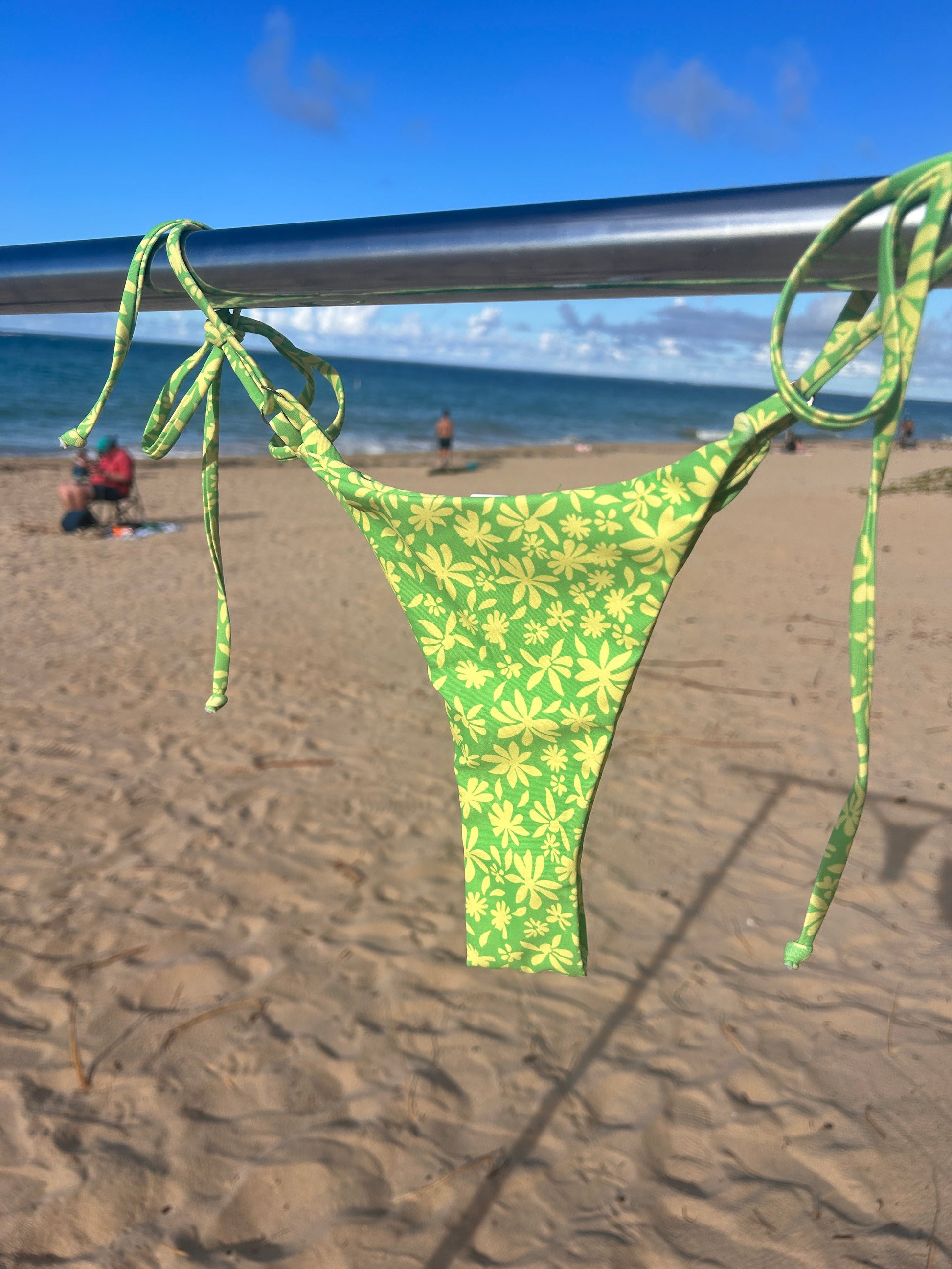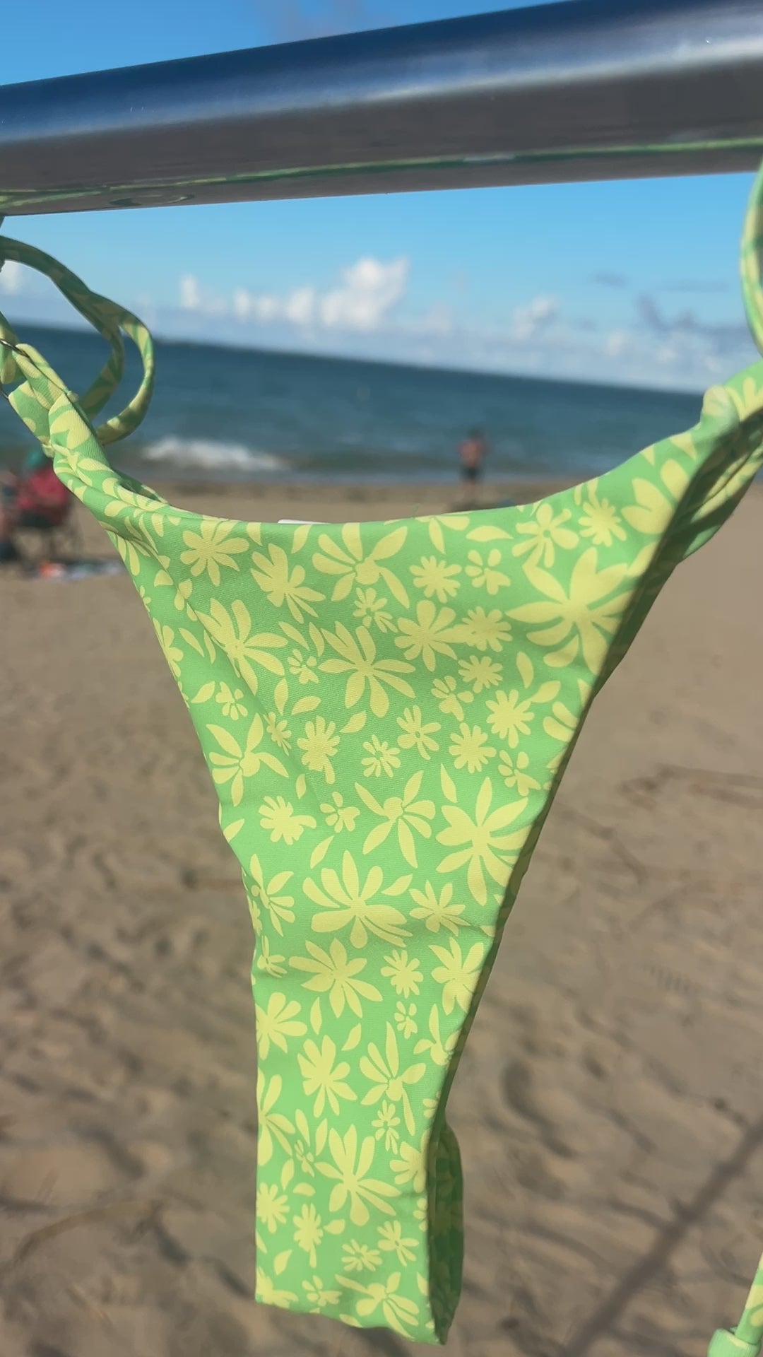 Traje de baño color verde con flores en tonos verde claro con amarillo. Es ajustable ambas piezas. El top en el área del cuello u hombros. El bottom es ajustable en la espalda. El bottom es thong like. Se venden ambas piezas juntas. Puedes escoger el size de ambas piezas.