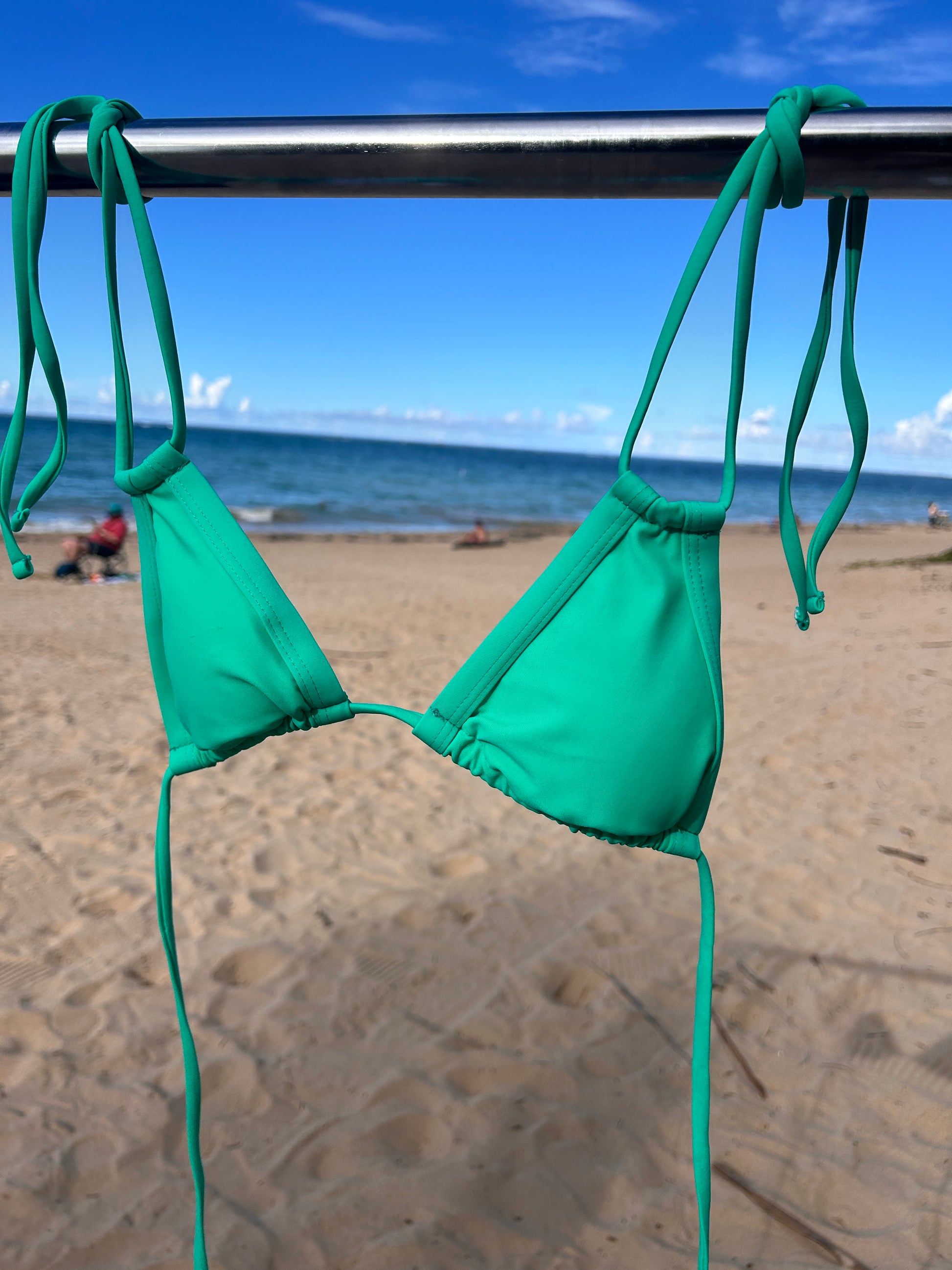 Basic triangle top with a twist.Tiene doble straps para mejor agarre y ajuste en el cuello. Puedes ajustarlo en la espalda. El bottom no es ajustable. Se venden ambas piezas juntas y puedes escoger distintos sizes para las pieza.