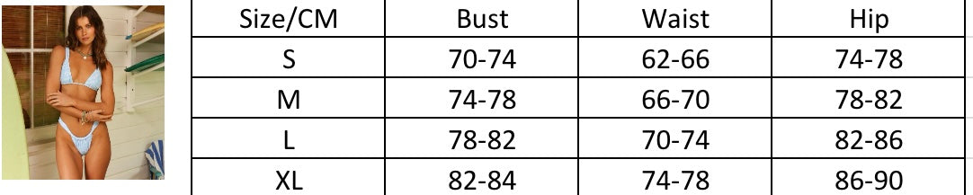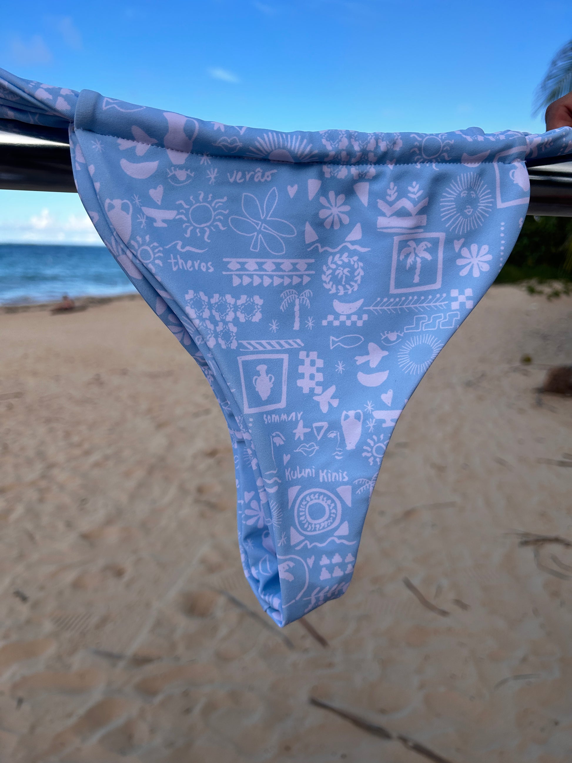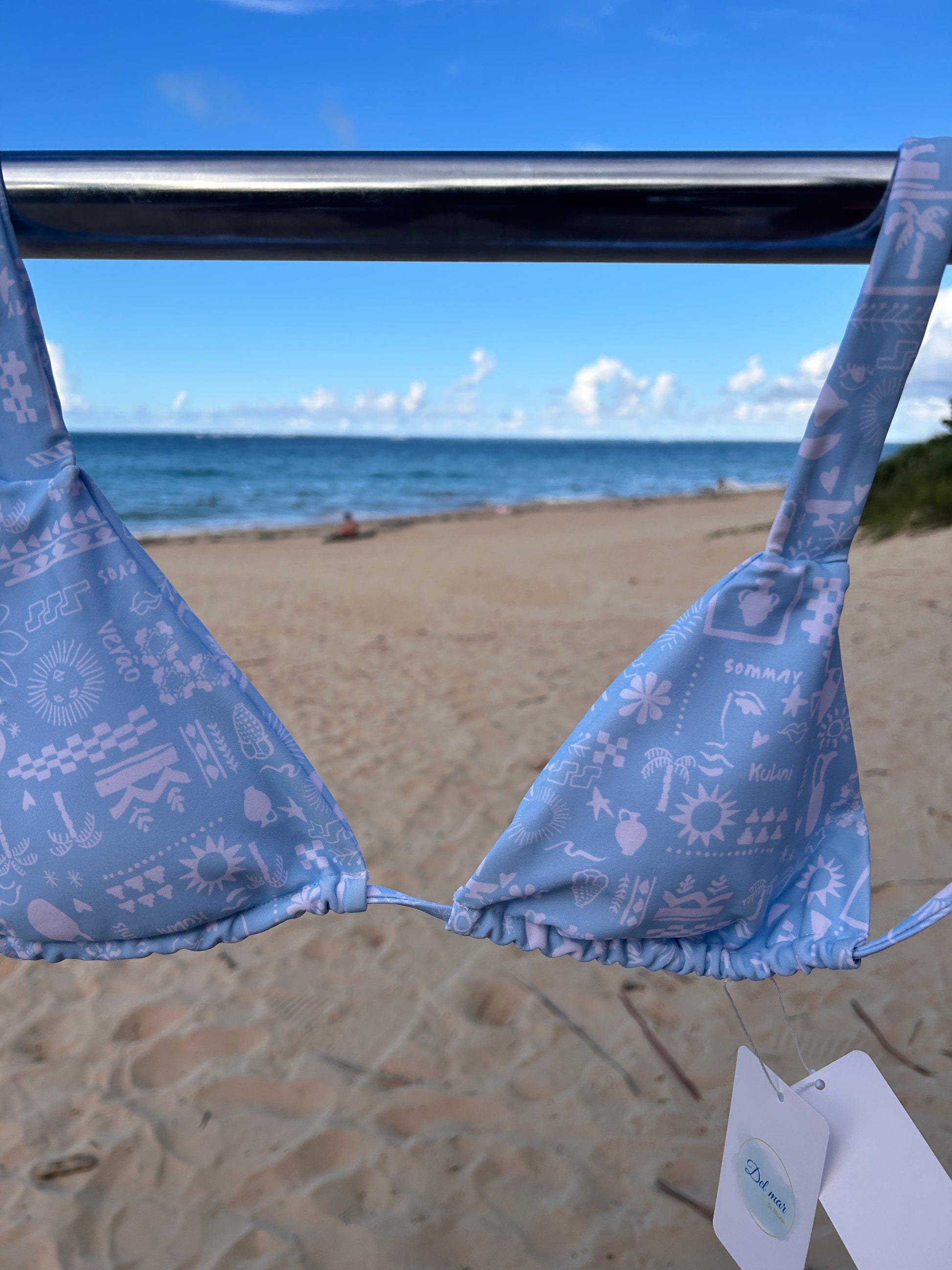 Bikini set color azul clarito con diseños de barcos, sol, olas, en color blanco. Ajustable en el top por la parte de los hombros y la espalda. Bikini bottom no es ajustable. Se venden ambas piezas juntas, con los sizes que elijan para cada pieza.